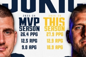 体育资讯4月7日讯 今天,掘金官方晒出了约基奇本赛季和他上个MVP赛季的数据对比图。